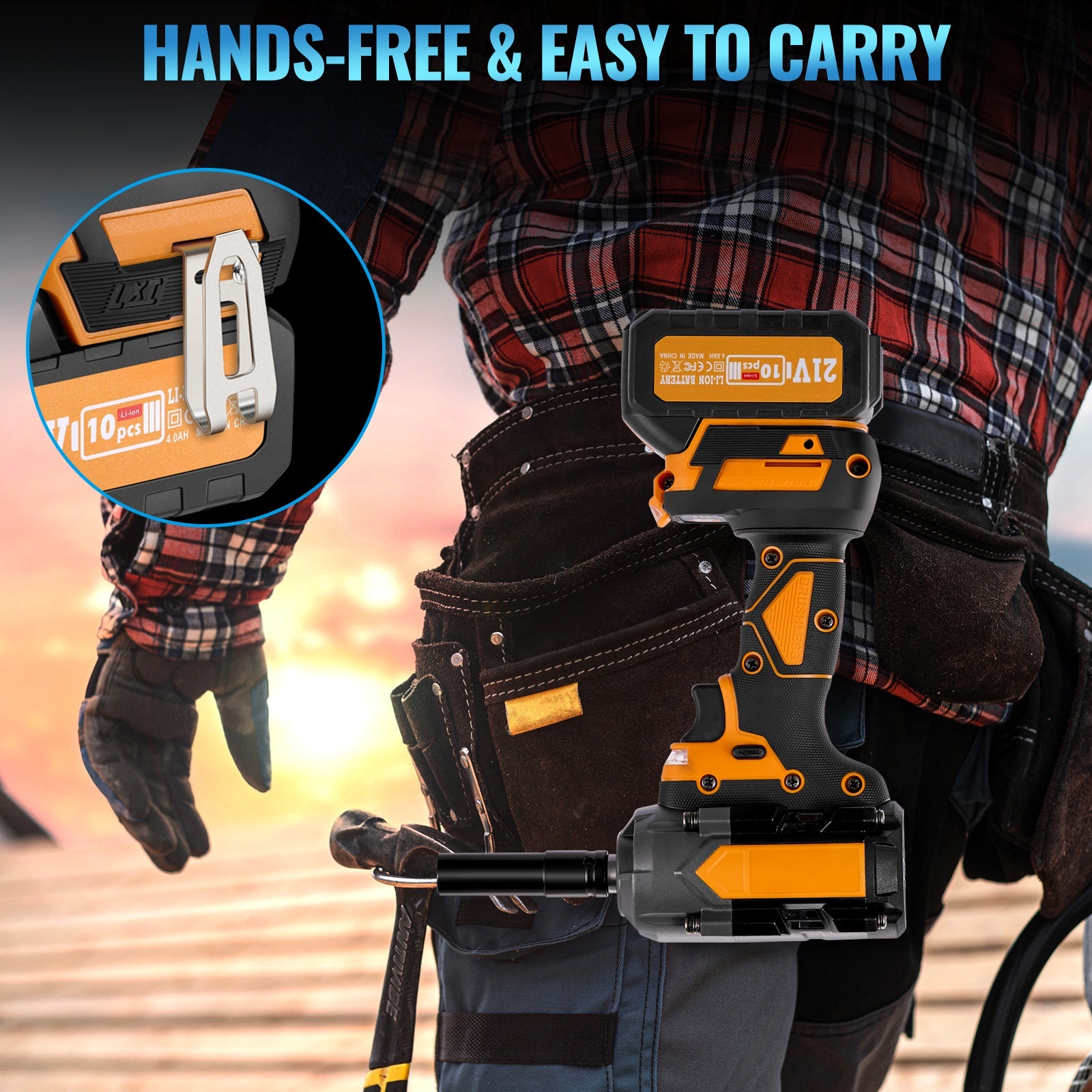 ➤【LIGHTWEIGHT & PORTABLE DESIGN】: Weighing just 4.8 lbs with one battery, this battery-powered impact wrench is easy to handle with one hand. Its compact form, non-slip grip, and anti-drop housing make it ideal for overhead work or tight spaces. The belt clip adds convenience on the go. Built for power—balanced for comfort.