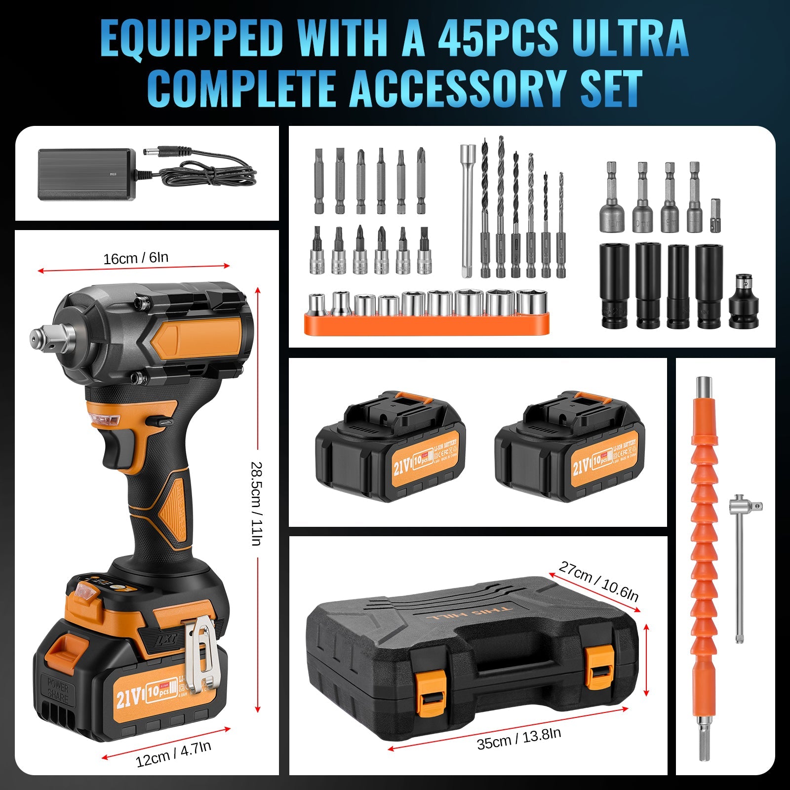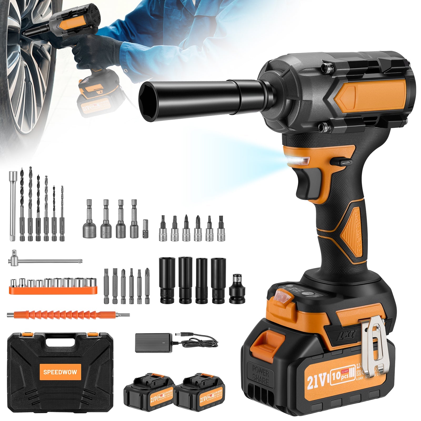 SPBTAR 1/2" Cordless Impact Wrench Kit, 1000N·m Brushless Motor, 21V 4.0Ah x2 Battery, 45PCS Socket & Drill Set for Car, Truck, RV, DIY