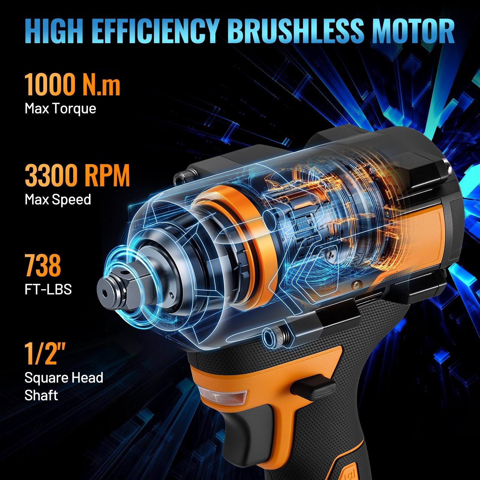 ➤【1000N·M HIGH TORQUE & BRUSHLESS MOTOR】: SPBTAR 1/2" cordless brushless impact wrench delivers up to 738 ft-lbs (1000N·m) of max torque and a no-load speed of 2,510 RPM for unstoppable performance. Its advanced brushless motor boosts efficiency, runs quieter, and extends tool life—no sparks, no maintenance. Whether you're removing lug nuts, tightening bolts, or handling DIY garage jobs, this powerful tool makes tough tasks easy. A true workhorse that gets the job done—fast.
