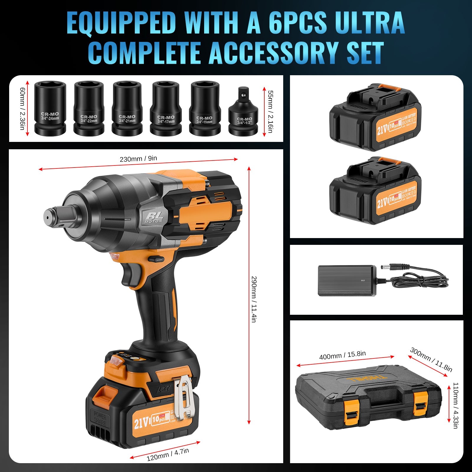 ✦ 12PCS ACCESSORY SET & WIDE APPLICATIONS: Comes with five sockets (17–24mm), a 3/4" to 1/2" adapter, charger, two batteries, and a durable carrying case. Use it as an impact wrench, driver, or drill on cars, trucks, RVs, tractors, farm tools, and garage projects—your all-in-one heavy-duty torque solution.