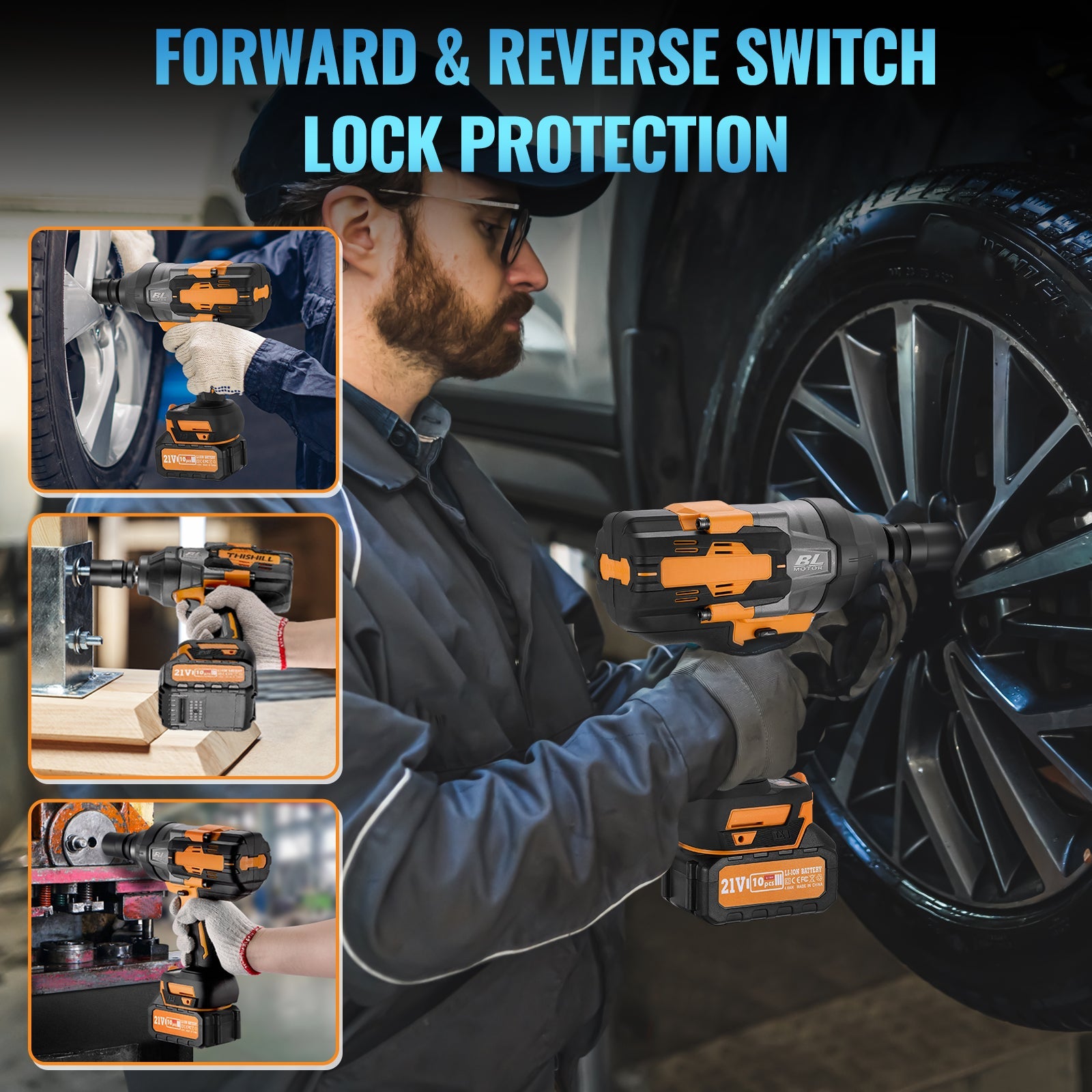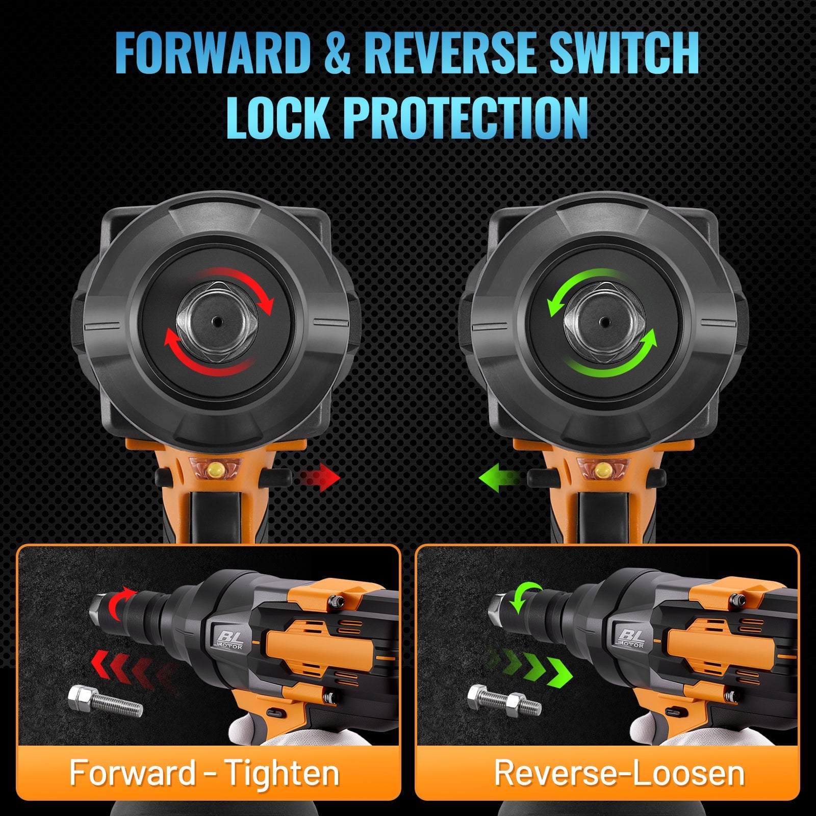 ✦ AUTO-BRAKE & SAFETY-FOCUSED REVERSE: The intelligent auto-stop function halts reverse rotation immediately after nut removal, preventing flying fasteners and thread damage. Forward/reverse/lock controls are conveniently placed for thumb operation—safer, smarter, more reliable performance.