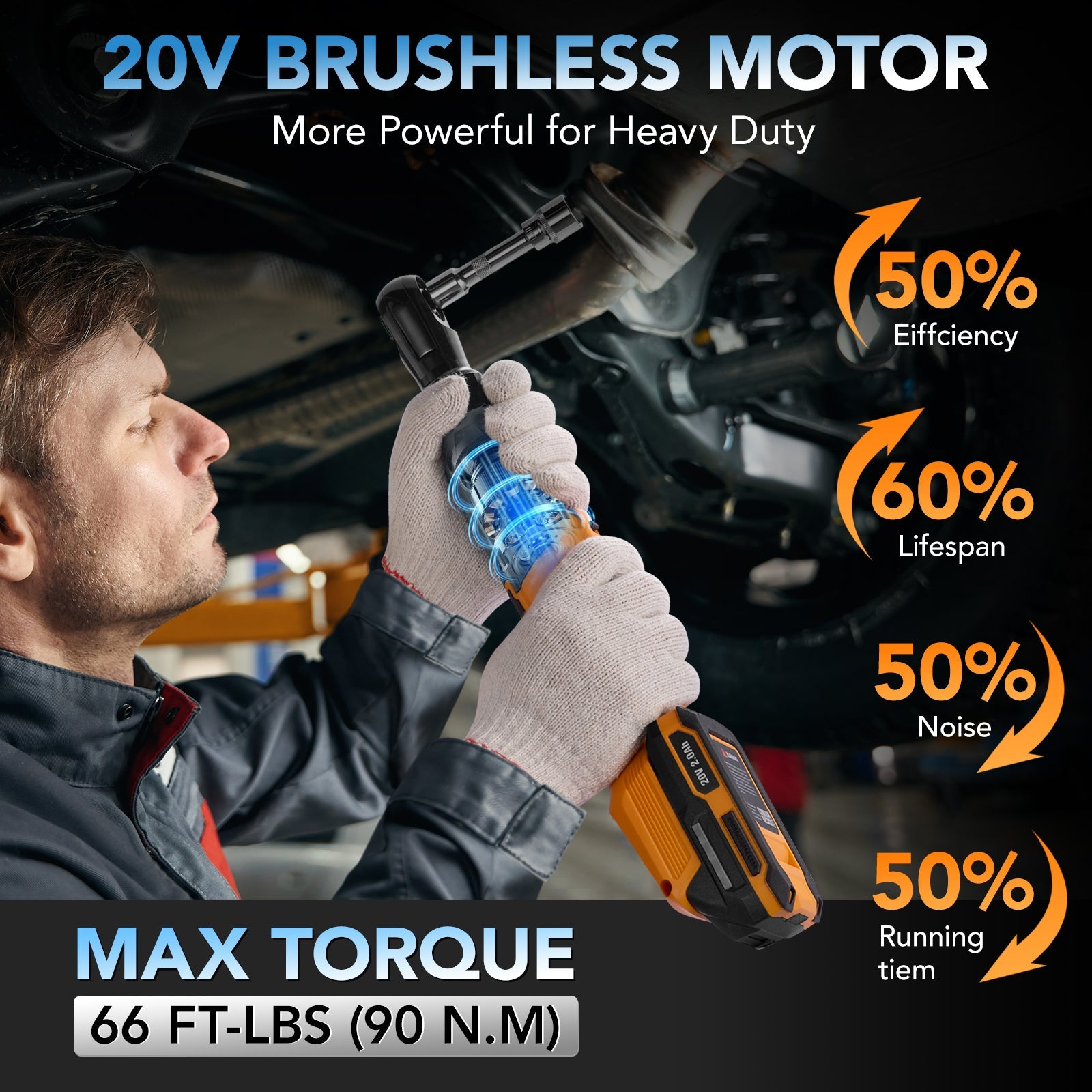- ♦ Powerful Brushless Motor for High Torque Jobs: Delivers up to 89 ft-lbs (120 Nm) of torque and 250 RPM. The 20V brushless motor ensures more power, less heat, and longer service life—perfect for heavy-duty repairs and daily maintenance.