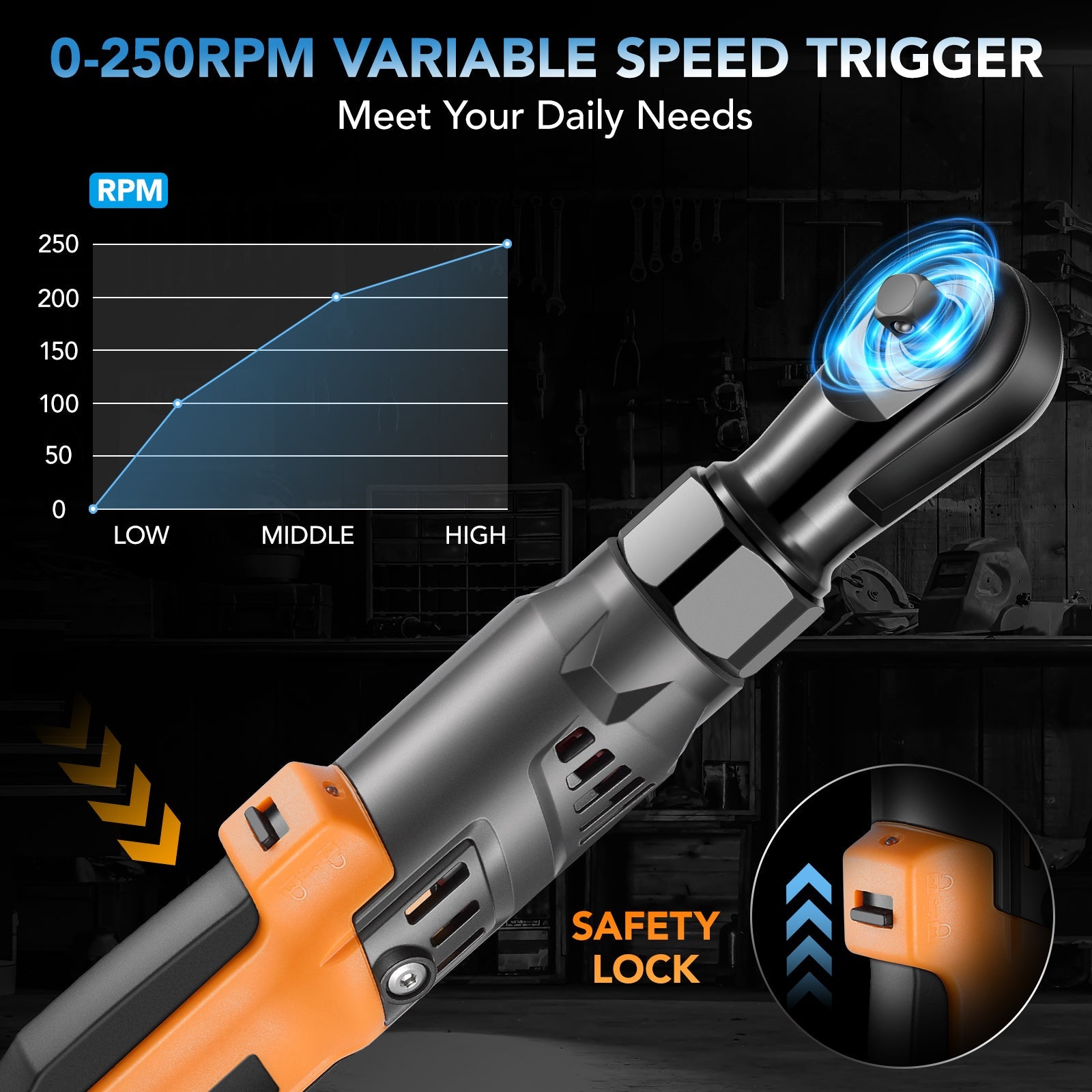 - ♦ Precise Speed Control & Safety Lock: Variable-speed trigger lets you fine-tune power output from 0–250 RPM. Forward/reverse switch and safety lock offer secure, accurate control for any job.