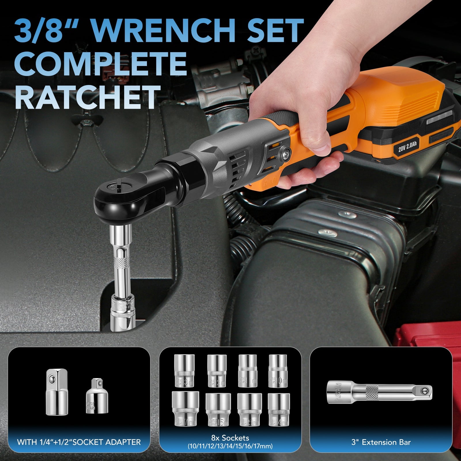 SPBTAR 3/8" Cordless Ratchet Wrench, 89Ft-lbs (120Nm) Brushless Power Tool Kit, 20V 250RPM with 2x2.0Ah Batteries, 8 Sockets, Charger for Car, Motorcycle, Home Repairs