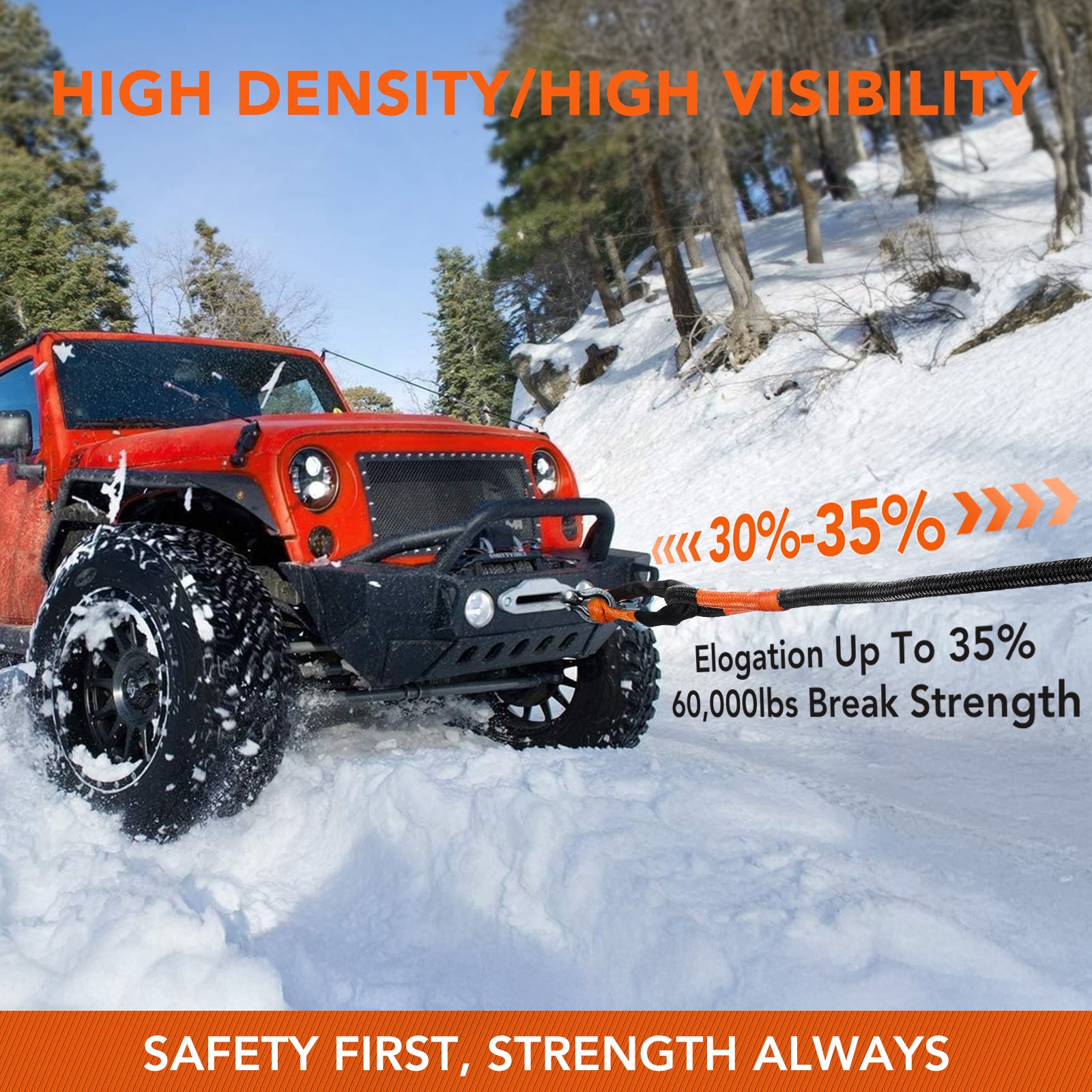 🚙 35% Stretch for Safe Recovery: Made from superior Nylon 66 material, the strap offers 35% elongation and excellent shock absorption. This critical feature allows for a smoother, safer pull, effectively extracting vehicles from mud, sand, snow, or steep slopes without transferring excessive shock load, minimizing the risk of vehicle damage.